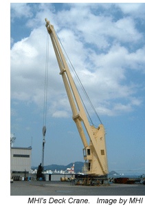 Marine deck cranes are located on the decks of cargo ships and are used for cargo loading and unloading. MHI presently enjoys the largest share, 40%, of the Japanese market. For some time the company has been looking for a way to effectively penetrate into the shipyards of the STX group, a major player in Korea, a shipbuilding superpower. Meanwhile STX Construction (Dalian) has been seeking to enhance its deck crane portfolio through the addition of competitive machines. The intentions of the two companies thus meshed and led to the conclusion of the licensing agreement.
