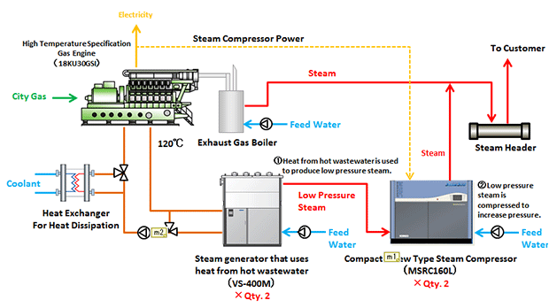 * 1 Typically, two sets of steam generators that use heat from hot wastewater and compact screw-type steam compressors are installed. External view of each equipment High-temperature specification gas engine