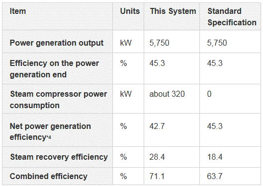 * 2: Calculation conditions: power factor of 0.95, two sets of steam generators that use the heat of hot wastewater and compact screw type steam compressors are installed, feed water temperature of 60°C, recovered steam pressure of 0.78 MPaG, and range of 50 Hz * 3: Value with the power consumption by the steam compressor * 4: The above table lists the reference performance values at the time of the feasibility study Mitsubishi Heavy Industries, Ltd. press release |