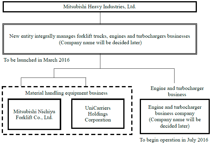 Move Aimed at Enhancing Competitive Strength with Integrated, Agile Management Tokyo, February 4, 2016 Today Mitsubishi Heavy Industries, Ltd. (MHI) decided in principle to launch a new wholly owned entity to integrally oversee its current businesses in material handling equipment centered on forklift trucks, engines and turbochargers. The new entity will serve as an independent management body to provide integrated and swift responsive oversight of these three core businesses. Under this initiative, MHI looks to generate synergy benefits, streamline its organization, and explore new fields as a way of significantly strengthening its competitiveness. Going forward, scale expansion and higher earning capacity will be pursued in a quest to achieve net sales reaching 1 trillion yen. The new business entity will be launched by a target date of March, initially overseeing the material handling equipment business. Subsequently, in July a firm taking over MHI's engine and turbocharger businesses will also come under the entity's corporate umbrella. In the material handling equipment business, equity in UniCarriers Holdings Corporation (Kawasaki, Kanagawa Pref.) will be assumed in March (planned) by the new business entity (acting on behalf of MHI) and Mitsubishi Nichiyu Forklift Co., Ltd. (Nagaokakyo, Kyoto Pref.), their ownership ratios to be 65% and 35% respectively. In tandem with that move, MHI's stake in Mitsubishi Nichiyu Forklift will be transferred to the new business entity. A new company to handle the engine and turbocharger businesses will be established in April in the form of a preparatory company founded as a prelude to taking over those businesses. Plans then call for a company split agreement to be concluded with MHI by May, with the takeover of the split businesses slated to take place in July. Capitalization will be furnished in full by the integration entity. As MHI's mass-manufactured products affected by the new business restructuring initiative today are undergoing globalization in development, production, procurement and sales, outstanding synergy benefits can be anticipated. Going forward, business in material handling equipment and engines will increasingly shift away from single unit sales to the provision of solution packages. Engineering advances in engines will drive a focus on distributed power generation and cogeneration type systems. Under these management measures the new integration entity will pursue swift strengthening of competitiveness targeted at significantly enhancing scale expansion and earning capacity. Organizational Structure