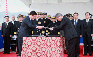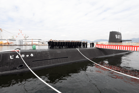 Tokyo, March 7, 2016 Mitsubishi Heavy Industries, Ltd. (MHI) delivered the "Jinryu" submarine to the Japanese Ministry of Defense (MOD) today in a ceremony held at the MHI Kobe Shipyard & Machinery Works' No.3 pier in Kobe, Hyogo Prefecture. The Jinryu is the seventh Soryu-class submarine supplied to the Japan Maritime Self-Defense Force (JMSDF), and the fourth built by MHI. MHI also built the first Soryu-class submarine, and has produced a total of 26 submarines at the MHI Kobe Shipyard over the last 70 years. The delivery ceremony was attended by a number of MOD officials including State Minister of Defense Kenji Wakamiya, JMSDF Chief of Staff Tomohisa Takei, and Acquisition, Technology and Logistics Agency Commissioner Hideaki Watanabe. MHI was represented by Hisakazu Mizutani, Executive Vice President of MHI and President & CEO of MHI Integrated Defense & Space Systems. Soryu-class submarines are the world's largest conventionally powered submarines. They have an excellent operational track record and are equipped with state-of-the art technologies, including air-independent propulsion (AIP) systems that enable them to remain fully submerged for long periods of time, and advanced stealth technologies that make them extremely difficult to detect. Major Specifications and Building Schedule of "Jinryu" Specifications Length overall: 84.0 meters (m) Breadth: 9.1 m Depth: 10.3 m Displacement: 2,950 tonnes (submerged displacement: 4,100 tonnes) Main engine: Diesel-Stirling-electric, one shaft Maximum output: 8,000 PS Maximum speed: 20 knots Complement: about 65 Armament and other equipment: Torpedo tubes, snorkel, submarine sonar system, etc. Building Schedule Keel laid: February 14, 2012 Launched: October 8, 2014 Delivered: March 7, 2016 Mitsubishi Heavy Industries, Ltd. press release |