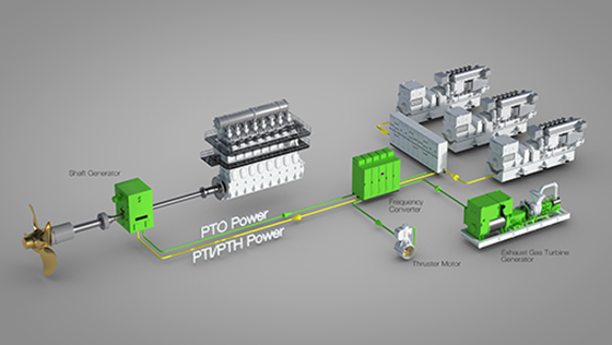 Tokyo - December 12, 2017 Mitsubishi Heavy Industries Marine Machinery & Equipment Co., LTD (MHI-MME) and the smart technology group Wärtsilä have signed a Memorandum of Understanding (MOU) regarding the commercial marketing of a new energy solution for ships. The solution combines innovative technologies from both companies to produce greater power generation capacity and higher propeller propulsion for marine vessels. By integrating MHI-MME's waste heat recovery and energy saving power generation system (WHRS) with Wärtsilä's operational control technology for shaft generator systems, the new solution results in more energy efficient ship navigation and an improved Energy Efficiency Design Index (EEDI). A notable innovation is the combining of a power take off/take in (PTO/PTI) shaft generator system with WHRS to improve the stability of the WHRS. Depending on the load of the main engine and the ship's network, the WHRS sometimes produces electrical energy in excess of that needed by the network. Such energy can be utilised via the PTO/PTI generator to drive the propeller shaft. At full load, the surplus energy can be used to assist the ship's drive by being applied directly to the propeller shaft. At low main engine load, the WHRS can be operated in parallel with a diesel generator set. Parallel operation with a shaft generator via PTO operation is also easily implemented. The patented design connects the WHRS generator into the DC link circuit of the PTO/PTI shaft generator rather than directly into the mains. This allows operation of the WHRS at reduced speed to create higher efficiency of the turbine system at part load. In so doing, it avoids the necessity of speed regulation valves, which cause throttle or bypass losses. MHI-MME has various energy saving technologies and all of those fit for this new solution. One example is integration with MHI-MME's power turbine generator and this combination enables to supply electricity across a range from approximately 500 to 2,000 kilowatts (kW), driven by gas extracted from a 2-stroke main engine, via the PTO/PTI generator. MHI-MME's solutions have until now consisted of waste heat recovery systems and Organic Rankine Cycle (ORC) systems, which are small-scale binary power generation systems that efficiently recover and use extremely low-temperature heat sources. Applications have primarily focused on large container ships. Now, with addition of the latest solution, MHI-MME will offer an even wider array of energy-saving solutions for ships that have conventionally employed shaft generators, to help them comply with the more stringent environmental regulations to go into effect in the near future.
