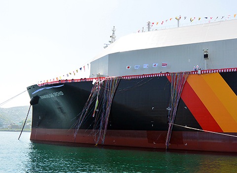 • LNG carrying capacity and fuel performance significantly improved through enhanced hull structure and hybrid propulsion system • Christening held at Nagasaki Works; completion set for late June Tokyo - April 18, 2018 Mitsubishi Shipbuilding Co., Ltd., a Group company of Mitsubishi Heavy Industries, Ltd. (MHI) based in Yokohama, today held the christening ceremony for a next-generation LNG (liquefied natural gas) carrier under construction for a joint venture of Mitsubishi Corporation and Nippon Yusen Kabushiki Kaisha (NYK Line). The ship, named "Diamond Gas Orchid," is the first "Sayaringo STaGE" type vessel, Mitsubishi Shipbuilding's newest carrier that achieves significant improvements in both LNG carrying capacity and fuel performance thanks to a more efficient hull structure and an innovative hybrid propulsion system. After completion in late June, the Diamond Gas Orchid will go into service transporting LNG for the Cameron LNG Project, a project in the U.S. state of Louisiana in which Mitsubishi Corporation and NYK Line are jointly participating.
