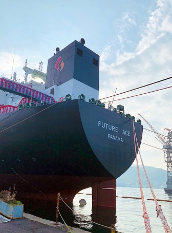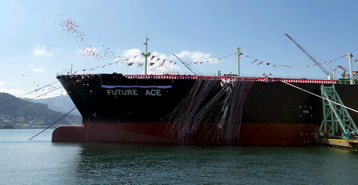 Vessel for JX Ocean Tokyo, March 13, 2019 • Energy efficient vessel compatible with major LPG terminals worldwide and the expanded Panama Canal • Mitsubishi Shipbuilding's first ship equipped with the Mitsubishi SOx Scrubber System, compliant with 2020 regulations on marine SOx emissions • Built by MHI Marine Structure in Nagasaki, with tank holding capacity of 83,000m3 Mitsubishi Shipbuilding Co., Ltd., a Group company of Mitsubishi Heavy Industries, Ltd. (MHI) based in Yokohama, held a christening ceremony on March 12th for a liquefied petroleum gas (LPG) carrier currently under construction for JX Ocean Co., Ltd. The new ship, named FUTURE ACE, will be the twelfth of Mitsubishi Shipbuilding's latest third-generation, 83,000m3-class LPG carriers. In addition to increased energy-efficiency, the ship will have the capability to adapt flexibly to major LPG terminals worldwide, as well as specifications compatible with the new expanded Panama Canal. Completion and delivery is scheduled for the end of March, 2019. The christening ceremony, held at MHI's Nagasaki Shipyard & Machinery Works, was attended by representatives of the ship owner, along with many other guests. JX Ocean President and Representative Director Shinji Inaba announced the name of the ship, while the wife of the charterer's representative performed the ceremonial rope cutting. The FUTURE ACE has a length of 230m, width of 36.6m, and depth of 21.65m, with a draft of 11.55m. Gross tonnage is 48,167 tons, with a total tank holding capacity of 83,000m3. Launching took place on December 27th, 2018. Construction was managed by Mitsubishi Heavy Industries Marine Structure Co., Ltd., an MHI Group company based in Nagasaki. The name "FUTURE" refers to the "X" (meaning "future") of the JXTG Group, of which JX Ocean is a part. "ACE" was chosen because A (the first letter of the English alphabet) represents the first of newly constructed LPG carriers that will be part of the planned FUTURE series, and because its association with "first-rate" or "forefront." Of note, this is the 29th vessel built under contract at Nagasaki Shipyard & Machinery Works for JX Ocean and its predecessor company. The FUTURE ACE is equipped with a proprietary hull form (developed with the design and manufacturing expertise of MHI Group) that aids in providing exceptional fuel-efficiency and compatibility with the various LPG terminals around the world. Specifically, the vessel utilizes the hull form (optimized with the latest development technologies) and a screw propeller, (combined with the Mitsubishi Reaction Fin) to improve overall propulsion efficiency. The ship is also equipped with the Mitsubishi SOx Scrubber System, which complies with the tighter regulations on marine SOx emissions that will come into effect in 2020. This is the first time Mitsubishi Shipbuilding has utilized this system for a ship built in-house. In a continuous effort to contribute to stable, global energy supplies and environmental conservation, Mitsubishi Shipbuilding and MHI Marine Structure will continue developing and refining fuel-efficient and sustainable LPG carriers.