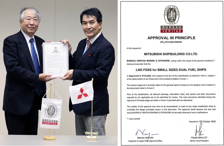 AIP for Basic Design of Fueling System for Marine Four-stroke Dual Fuel Engines Obtained from French Classification Society • Approval was granted to provide LNG fuel gas supply systems for small and mid-sized ships as well as large vessels • AIP presentation ceremony held today in Yokohama Tokyo - 19 October, 2020 Mitsubishi Shipbuilding Co., Ltd., a part of Mitsubishi Heavy Industries (MHI) Group, was granted Approval in Principle (AIP)(Note1) from the French Classification Society, Bureau Veritas (BV), for a liquefied natural gas (LNG) fuel gas supply system (FGSS) for marine four-stroke dual fuel engines(Note2). The certificate of AIP was presented today at Mitsubishi Shipbuilding’s headquarters in Yokohama. The FGSS comprises an LNG fuel tank, gas supply unit, control systems and other relevant equipment. The FGSS to which the AIP was granted this time was developed mainly to be installed on coastal ferries and small to mid-sized cargo ships, based on not only experience and knowledge obtained through shipbuilding of LNG carriers for many years but also technologies and know-how accumulated by development of FGSS products for large ships. The small size vacuum-insulated type tanks to be applied for the system have a double shell structure that ensures high heat insulation and also allows the external cylinder of the tank to be at normal temperature, which consequently simplifies the support structure of the tank and reduces the workload for the installation work. Further, the Tank Connection Space(Note3) is also designed to save space while giving consideration to realize easy operation and less maintenance. Mitsubishi Shipbuilding delivered its FGSS in 2019 to be installed on Japan’s first LNG-fueled car carrier, currently being built at Shin Kurushima Toyohashi Shipbuilding Co., Ltd., and has one more order for the ship currently under construction. Those large tanks with insulation coatings are designed to be the best fit for the installation in large vessels. Mitsubishi Shipbuilding will keep expanding its product lineup to meet the increasing demand for LNG fuel and will continue not only providing FGSS as a manufacturer, but also offering superior engineering services for gas handling-related equipment in order to support the design and construction of LNG-fueled ships regardless of the size and vessel type, contribute to the further development of ocean transport, and reduce the environment load. (1) Approval in Principle (AIP) indicates that a certification body has reviewed the basic design, and confirmed that it meets the technical requirements and standards for safety. The inspection of this system was conducted based on the IGF Code(Note4) with which compliance is required when using LNG fuel, and BV’s ship classification regulations. (2) A marine four-stroke dual fuel engine is an engine fitted mainly in small and mid-sized ships, and is able to use both conventional heavy oil and natural gas as fuel. (3) Tank Connection Space is a space surrounding all tank connections and tank valves. It is required under the IGF Code for tanks with such connections in enclosed spaces. (4) The International Code of Safety for Ships Using Gases or Other Low-flashpoint Fuels (IGF Code) is an international regulation stipulating the safety requirements for ships using LNG and other fuels with low flashpoints.
