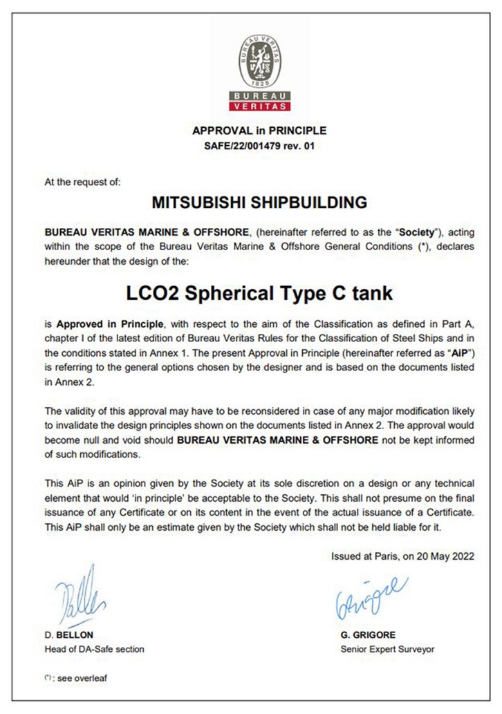 AIP for spherical cargo tanks for LCO2 carriers. Image by Mitsubishi Heavy Industries, Ltd. (1) Approval in Principle (AIP) indicates that a certification body has reviewed an item's basic design and confirmed that it meets technical requirements and safety standards. Inspection of Mitsubishi Shipbuilding's spherical cargo tank system was conducted based on the IGC Code as it applies to marine vessels that transport liquefied gas in bulk, as well as BV's own classification regulations. (2) The International Code for the Construction and Equipment of Ships Carrying Liquefied Gases in Bulk (IGC Code) is an international regulation stipulating the safety requirements for ships that transport LCO2, LNG, or other liquefied gases as cargo in bulk. (3) CCUS: carbon capture, utilization and storage Mitsubishi Heavy Industries, Ltd. press release