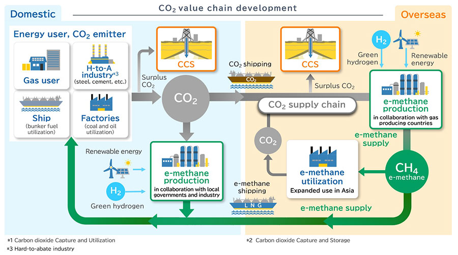 Tokyo, March 31, 2023 Osaka Gas Co., Ltd. (Osaka Gas) and Mitsubishi Heavy Industries, Ltd. (MHI) have entered into an agreement to conduct a feasibility study on a project to develop a CO2 value chain for CCUS (Carbon Capture, Utilization, and Storage), including transporting CO2 captured in Japan to overseas, utilizing it to produce e-methane, synthetic gas produced through methanation, and storing it underground. The project aims to establish an efficient CO2 value chain, leveraging Osaka Gas's know-how on e-methane production and CO2 storage and MHI's expertise in CO2 capture, liquefied CO2 maritime vessel transport, and CO2 management. To that end, the project partners will examine methods to capture CO2 emitted from the Hard-to-Abate industries, such as steel, cement, and chemicals, and transport liquefied CO2 using ships. Osaka Gas and MHI will conduct a feasibility study on the entire CCUS scheme, including CO2 utilization for e-methane and underground sequestration, in corporation with companies from a wide variety of industries. The project also plans to expand its CCUS scheme through the trade and transfer of CCUS's environmental value quantified by CO2NNEX, a digital platform under development by MHI and IBM Japan for visualizing CO2 value chain. Through this project, Osaka Gas and MHI aim to contribute to achieving a carbon neutral society by 2050, combining the two companies' technologies developed to meet their respective goals for net zero emissions.