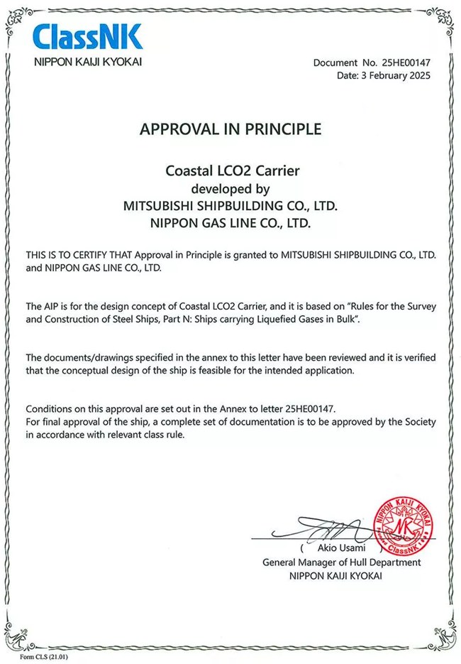 Target Set on Realizing Domestic CCS Business • Low-pressure Type Liquefied CO2 carriers are under development in pursuit of transportation from domestic emission sites to base site for overseas shipping, or domestic storage sites • Preparation is accelerating toward early market launch of LCO2 carriers, including applications in future CCS projects underway by the Japanese Government Tokyo, February 5, 2025 Mitsubishi Shipbuilding Co., Ltd., a part of Mitsubishi Heavy Industries (MHI) Group, and Nippon Gas Line Co., Ltd. (NGL) have jointly acquired Approval in Principle (AiP)(Note1) from Nippon Kaiji Kyokai (ClassNK) for a low-pressure type liquefied CO2 (LCO2) carrier to serve in coastal transportation. Demand for LCO2 carriers is expected to grow in tandem with CCS (carbon dioxide capture and storage) projects involving marine transport of CO2 captured in Japan to storage sites. Mitsubishi Shipbuilding and NGL received AiP certification from ClassNK following a jointly conducted concept study on low-pressure type coastal LCO2 carriers, assuming their use for transport from small-scale CO2 capture sites mainly in the Seto Inland Sea area to base site toward overseas storage sites. The concept study has been conducted in conjunction with the FY2024 "Japanese Advanced CCS Projects" carried out by the Japan Organization for Metals and Energy Security (JOGMEC). The LCO2 carrier receiving the newly acquired AiP is a versatile small-sized ship designed for use in domestic sea. MHI Group is currently pursuing strategic measures to strengthen its business for the energy transition. In conjunction with this initiative, Mitsubishi Shipbuilding is making efforts to contribute to the advancement of the maritime industries in Japan and around the world by utilizing its shipbuilding-based marine engineering technologies in addition to the conventional shipbuilding. Mitsubishi Shipbuilding will actively promote the development of LCO2 carriers and the establishment of CCS value chains through collaboration with various domestic/overseas companies. NGL is a participant of the "CCS Engineering Design Work in Sarawak, Malaysia" project(Note3), as the Japanese Advances CCS Projects in FY2024. The project calls for the launch of a sea transport scheme using highly versatile small-sized LCO2 carriers to consolidate CO2 collected in Japan for overseas shipping. The project aims to enhance business efficiency through shipment scale expansion. The LCO2 carrier newly acquiring AiP certification is expected to serve as a powerful means of sea transport supporting this scheme.