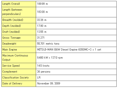 This vessel is a handy-max type bulk carrier of 56,000 dwt with a huge cargo hold capacity over 70,000 m3. This 56,000 dwt type bulk carrier series of MES is widely called “Mitsui’s 56” and is highly appreciated in the market. More than 150 units of this series have been ordered from MES.