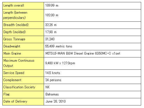 This vessel is a handy-max type bulk carrier of 56,000 dwt with a huge cargo hold capacity over 70,000m3 and marks the 106th ship of its series.