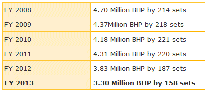 Mitsui Engineering & Shipbuilding Co., Ltd. (MES with president Mr. Yasuhiko Katoh) has produced 3.83 million horsepower (BHP) by 187 sets of Mitsui-MAN B&W Diesel Engine at its Tamano Woks, (Okayama Prefecture) for fiscal year 2012, while the production in the previous year was 4.31 million horsepower (BHP) by 220 sets.