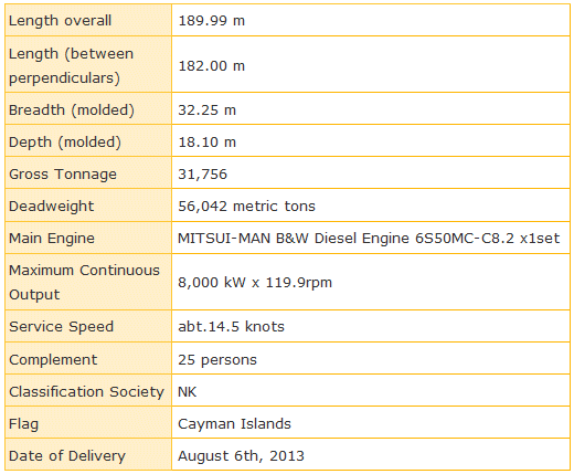 This vessel is a handy-max type bulk carrier of 56,000 dwt with a large cargo hold capacity over 70,000 m3 and marks the 159th ship of its series.
