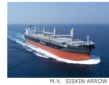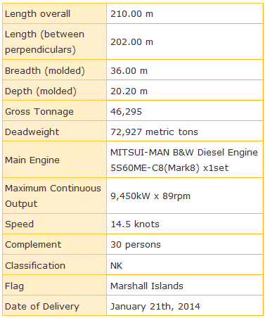Special Features 1. The Vessel is one of the largest open hatch general cargo carriers in the world with eight (8) box-shaped cargo holds and four (4) jib cranes for handling cargo. 2. The vessel has three (3) pairs of piggyback-type hatch covers (*) to have large hatch openings. 3. The vessel has large hatch openings, which has no protruding object, and higher structural reliability with the characteristic structure of the hatch corners. 4. In consideration of carrying forest products, bulkheads of cargo hold have no protruding objects and dehumidifier system is provided. 5. Fittings for container and packaged lumber loading are fitted on the hatch covers. 6. A hydrodynamic energy saving device on the rudder achieves good propulsive performance. 7. MITSUI-MAN B&W Diesel Engine 5S60ME-C8 is a light, compact and high output electronically controlled engine complying with MARPOL NOx restriction for exhaust gas. 8. The bow thruster and high-lift rudder enables good maneuverability in port. 9. The vessel has a ballast water treatment system for protection of marine environment in advance of forthcoming entry into force of Ballast Water Management Convention. 10. (*):Piggyback-type hatch cover; The system consists of a pair of two panels, i.e., "Lifting panel"& "Rolling panel". "Rolling panel" rolls to underneath of the lifted "Lifting panel" and after that the "Lifting panel"is piled on to the back of "Rolling panel". Piled panels can be moved between two neighboring hatches by endless chain system with hydraulic motor. This system can save hatch cover stowage space around hatchway, and realizes wide hatch opening. (MES) Mitsui Engineering & Shipbuilding Co. Ltd. press release |