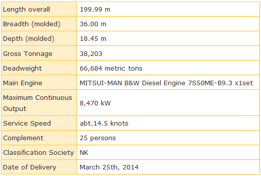 7. Main Engine, MITSUI-MAN B&W Diesel Engine 7S50ME-B9.3, complying with MARPOL NOx restriction (Tier-II) for exhaust gas emissions, gives superior fuel oil consumption over wide range of output. 8. Considering strengthened restriction for SOx, the ship has low sulfur fuel oil tanks, which are designed for operation in ECA (Emission Control Areas). 9. The vessel is designed in accordance with IACS Common Structural Rules. (MES) Mitsui Engineering & Shipbuilding Co. Ltd. press release |