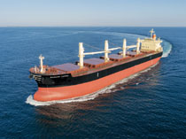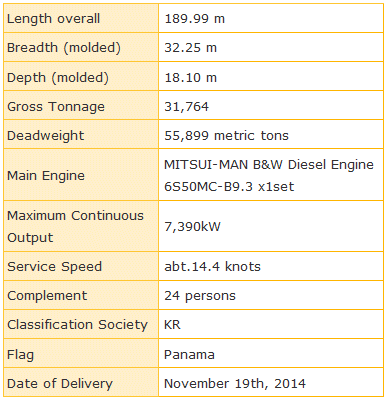 Special Features 1. The vessel has four (4) cranes and five (5) cargo holds, and keeps the superior usability of “Mitsui 56”. 2. The length is less than 190m and keeps the superior usability in consideration of domestic and foreign ports. 3. The vessel is designed for loading various cargos like coal, ore, grain, as well as lengthy/heavy cargo such as steel pipe and hot coil. 4. The new form of the bow and stern makes it possible to keep good performance in rough sea conditions as well as calm sea conditions and shows better maneuverability. 5. The size of hatch opening is the largest for this type of vessel in terms of both length and width. 6. Main Engine, MITSUI-MAN B&W Diesel Engine 6S50ME-B9.3, complying with MARPOL NOx restriction (Tier-II) for exhaust gas emissions, gives superior fuel oil consumption over wide range of output. 7. Considering strengthened restriction for SOx, the ship has low sulfur fuel oil tanks, which are designed for operation in ECA (Emission Control Areas). 8. The vessel is designed in accordance with IACS Common Structural Rules. (MES) Mitsui Engineering & Shipbuilding Co. Ltd. press release |
