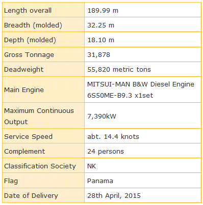 Special Features 1. The vessel has four (4) cranes and five (5) cargo holds, and keeps the superior usability of “Mitsui 56”. 2. The length is less than 190m and keeps the superior usability in consideration of domestic and foreign ports. 3. The vessel is designed for loading various cargos like coal, ore, grain, as well as lengthy/heavy cargo such as steel pipe and hot coil. 4. The new form of the bow and stern makes it possible to keep good performance in rough sea conditions as well as calm sea conditions and shows better maneuverability. 5. The size of hatch opening is the largest for this type of vessel in terms of both length and width. 6. Main Engine, MITSUI-MAN B&W Diesel Engine 6S50ME-B9.3, complying with MARPOL NOx restriction (Tier-II) for exhaust gas emissions, gives superior fuel oil consumption over wide range of output. 7. Considering strengthened restriction for SOx, the ship has low sulfur fuel oil tanks, which are designed for operation in ECA (Emission Control Areas). 8. The vessel is designed in accordance with IACS Common Structural Rules. (MES) Mitsui Engineering & Shipbuilding Co. Ltd. press release |