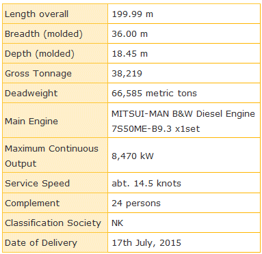 Special Features 1. The vessel has five (5) cargo holds and four (4) cranes for handling cargo, and keeps the superior usability of “Mitsui 56”. 2. The ship is designed to have enough deadweight more than 66,000 metric tons and capacity more than 82,800 cubic meters for loading various cargos like coal, ore, grain, as well as lengthy/heavy cargo such as steel pipe and hot coil. 3. Fuel oil consumption is less than that of a conventional Supramax bulk carrier despite its enlargement. 4. As a result of research work of interviews with ship owners and operators, investigations on ports all over the world and present trade patterns, wide beam (over-P’max) and shallow draft make it possible to have wide flexibility for operations and high transport efficiency. 5. The new hull form makes it possible to keep good performance in rough sea conditions as well as calm sea conditions and shows better maneuverability. 6. The size of hatch opening is the largest for this type of vessel in terms of both length and width. 7. Main Engine, MITSUI-MAN B&W Diesel Engine 7S50ME-B9.3, complying with MARPOL NOx restriction (Tier-II) for exhaust gas emissions, gives superior fuel oil consumption over wide range of output. 8. Considering strengthened restriction for SOx, the ship has low sulfur fuel oil tanks, which are designed for operation in ECA (Emission Control Areas). 9. The vessel is designed in accordance with IACS Common Structural Rules. (MES) Mitsui Engineering & Shipbuilding Co. Ltd. press release |