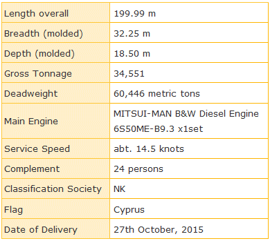 6th Ship of MES’s Eco-Ship "neo60BC" October, 27, 2015 Mitsui Engineering & Shipbuilding Co., Ltd. (MES) completed and delivered a 60,000 dwt type bulk carrier M.V. "STH LONDON" (MES Hull No. 1899) at its Chiba Works on 27th October, 2015 to Sea Trade Holdings Inc., Marshall Islands. This is the 6th ship of our “neo60BC”, the third Eco-Ship line up of our “neo series”. Principal Particulars