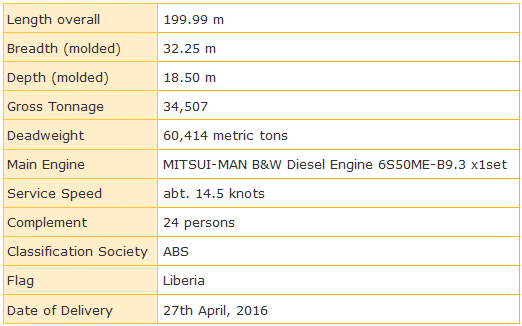 12th Ship of MES’s Eco-Ship "neo60BC" 27th April, 2016 Mitsui Engineering & Shipbuilding Co., Ltd. (MES) completed and delivered a 60,000 dwt type bulk carrier M.V. "SBI ZEUS" (MES Hull No. 1906) at its Chiba Works on 27th April, 2016 to SBI Zeus Shipping Company Limited, Marshall Islands. This is the 12th ship of our “neo60BC”, the third Eco-Ship line up of our “neo series”. Principal Particulars