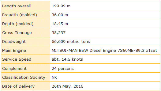 2. The ship is designed to have enough deadweight more than 66,000 metric tons and capacity more than 82,800 cubic meters for loading various cargos like coal, ore, grain, as well as lengthy/heavy cargo such as steel pipe and hot coil. 3. Fuel oil consumption is less than that of a conventional Supramax bulk carrier despite its enlargement. 4. As a result of research work of interviews with ship owners and operators, investigations on ports all over the world and present trade patterns, wide beam (over-P’max) and shallow draft make it possible to have wide flexibility for operations and high transport efficiency. 5. The new hull form makes it possible to keep good performance in rough sea conditions as well as calm sea conditions and shows better maneuverability. 6. The size of hatch opening is the largest for this type of vessel in terms of both length and width. 7. Main Engine, MITSUI-MAN B&W Diesel Engine 7S50ME-B9.3, complying with MARPOL NOx restriction (Tier-II) for exhaust gas emissions, gives superior fuel oil consumption over wide range of output. 8. Considering strengthened restriction for SOx, the ship has low sulfur fuel oil tanks, which are designed for operation in ECA (Emission Control Areas). 9. The vessel is designed in accordance with IACS Common Structural Rules. (MES) Mitsui Engineering & Shipbuilding Co. Ltd. press release