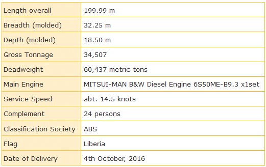 16th Ship of MES’s Eco-Ship "neo60BC" 4th October, 2016 Mitsui Engineering & Shipbuilding Co., Ltd. (MES) completed and delivered a 60,000 dwt type bulk carrier M.V. "SBI APOLLO" (MES Hull No. 1912) at its Chiba Works on 4th October, 2016 to SBI Apollo Shipping Company Limited, Marshall Islands. This is the 16th ship of our “neo60BC”, the third Eco-Ship line up of our “neo series”. Principal Particulars