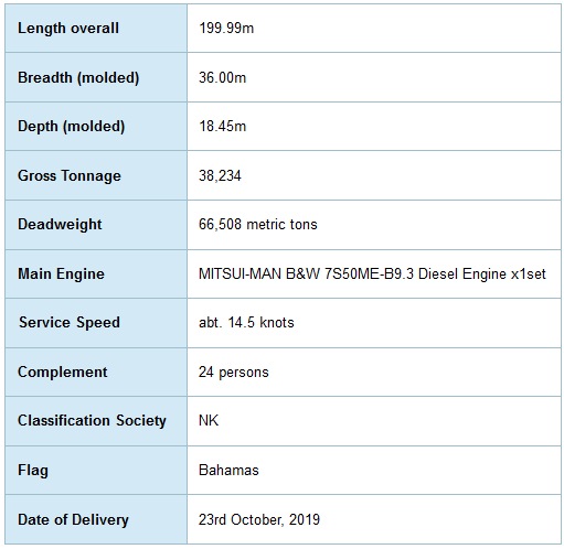 20th Ship of MES’s Eco-Ship "neo66BC" Oct 23,2019 MITSUI E & S SHIPBUILDING CO., LTD. (MES-S) completed and delivered a 66,000 dwt type bulk carrier M.V. "TOMAROS" (Hull No.1947) at its Tamano Shipyard on 23rd October, 2019 to TOMAROS NAVIGATION SA, Liberia. This is the 20th ship of our "neo66BC", the "wide beam shallow draft vessel" of our line-up "neo series". Principal Particulars
