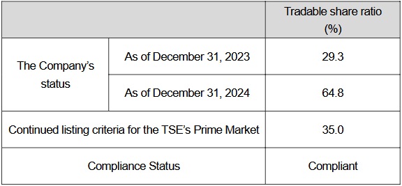 Tokyo, July 18, 2024 MODEC, INC. (the "Company") announces that it has received a notice of compliance with the continued listing criteria (distribution standard) from the Tokyo Stock Exchange ("TSE") and confirms that, as of December 31, 2024, it has satisfied the compliance requirements for the continued listing on the TSE's Prime Market. The Company's status of compliance with the continued listing criteria As of December 31, 2023, the Company did not meet the "tradeable share ratio" criteria among the continued listing criteria for the Prime Market. However, following the initiatives taken based on the "Plan to comply with the criteria to maintain listing under the TSE market categories" released on March 15, 2024, the Company confirms that it has satisfied all the continued listing criteria for the Prime Market. The Company will continue to make the efforts to maintain the compliance with the criteria for the listing on the Prime Market and enhance its enterprise value.