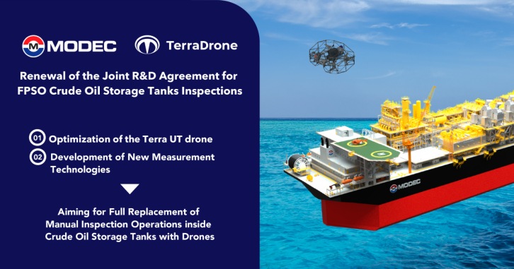 Building on Past Achievement to Further Advanced Drone Technology and Operational Efficiency Tokyo, Jun. 17, 2025 MODEC, Inc. ("MODEC") announced that it has renewed its joint research and development ("R&D") agreement with Terra Drone Corporation ("Terra Drone") for the non-destructive internal inspection of crude oil storage tanks on Floating Production, Storage, and Offloading systems (FPSOs) using Terra UT drones. This renewed agreement builds upon the joint R&D contract signed by both companies in 2024, following significant achievements in improving measurement accuracy, enhancing safety, and reducing inspection time. The renewed partnership aims to further advance the practical application and operational deployment of this technology.