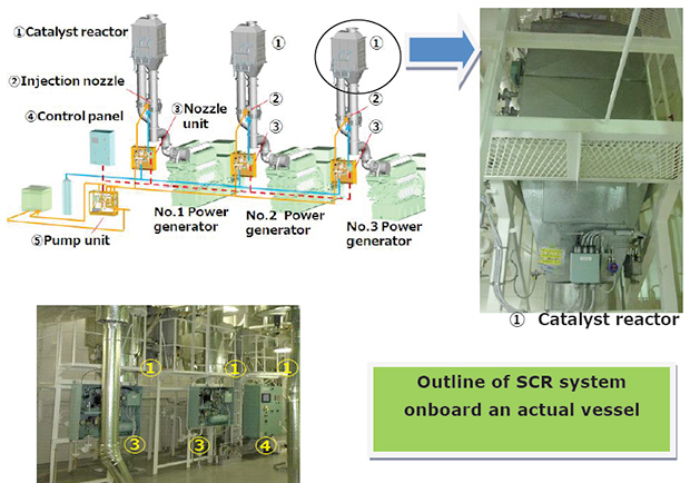 Outline of onboard SCR system and details of test operation 1. Install catalytic reactors with bypass systems onboard an actual vessel. This will save space in the engine room and simplify the naval architects in the engine room. 2. Reduce space required for peripheral equipment by integrating control of three NOx-reducing SCR devices. 3. Test operation onboard an actual vessel is scheduled for two years, confirming the following points related to operability, as well as procedures for refilling the aqueous urea solution. • Monitor performance of three NOx-reducing devices under normal use on power generators. • Maintain performance of devices even when using fuel such as C heavy fuel oil, which is high in impurities. Outline of Awobasan Maru Length : 319m Breath : 54m Deadweight tonnage : About 225,000MT Shipyard : Namura Shipbuilding Co., Ltd. *International Maritime Organization (IMO) Tier III regulations The International Convention for the Prevention of Pollution from ships, MARPOL Annex VI regulates NOx emissions from vessels. If all goes smoothly, the diesel engines used on vessels built after 2016 will be required to reduce NOx emissions by more than 80% from the Tier I NOx emission standards in the Emission Control Areas, including North America. Mitsui O.S.K. Lines, Ltd. press release |