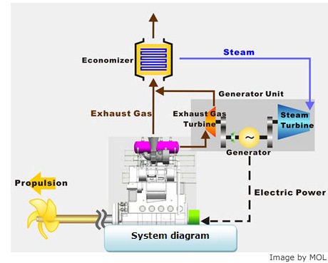 The system received the award recoveries weste heat energy in the exhaust of the main engine and generates electricity with high-efficiency integrated electric power generator - a combination exhaust gas turbine and steam turbine. The generated electricity is consumed not only to meet ship power demand but also to assist its propulsion by the shaft motor fitted to the crank shaft of main engine. By reducing the amount of fuel used by the main engine and power generators, the system also reduces CO2 emissions.