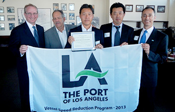 Contributing to a Cleaner Environment in both Ports Tokyo - August 5, 2014 Mitsui O.S.K. Lines, Ltd. (MOL; President: Koichi Muto) today announced that the company has earned recognition from the ports of both Long Beach and Los Angeles, California, for its efforts to ensure compliance with standards that call for vessels to slow down within 40 nautical miles (nm) of the shore. The Port of Long Beach introduced the Green Flag Program and Port of Los Angeles the Vessel Speed Reduction Program. The programs urge vessel operators to slow down to 12 knots or less within a certain range of the ports to reduce emissions of carbon dioxide (CO2), nitrogen oxide (NOx), and sulfur oxide (SOx) in coastal areas to conserve coastal environment, and offer annual rewards to vessel operators that achieve extraordinary compliance percentages. Every year, a total of 250 MOL Group-operated vessels including containerships calling at MOL's TRAPAC container terminal, as well as car carriers, tankers, and bulkers, navigate through the area covered by the speed standards. The ports have clearly appreciated the company's efforts to comply with the program and contribute to a cleaner coastal environment. MOL continually contributes to environmental conservation not only in this area, but also at other ports all over the world, and takes proactive environmental steps on a global scale. Mitsui O.S.K. Lines, Ltd. press release |