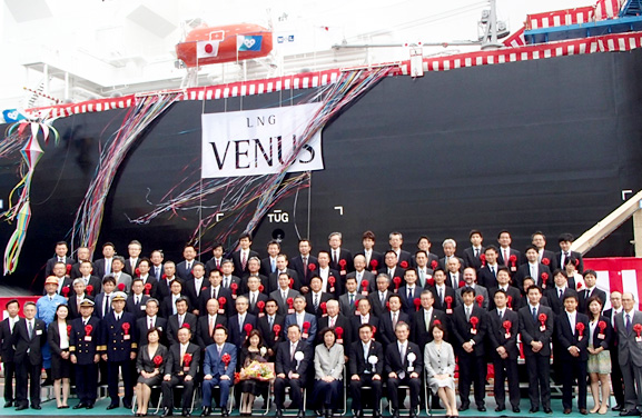 As a large group of guests looked on, Osaka Gas President Ozaki named the vessel, and his wife cut the rope. The LNG Venus is co-owned by MOL and Osaka Gas' wholly owned subsidiary, Osaka Gas International Transport Inc. (President: Shigeru Chikamoto; Headquarters: Osaka City, Osaka Prefecture). After its completion, it will sail under a charter contract with Osaka Gas. Aiming toward its goal of "solid growth through innovative changes" set forth in the midterm management plan STEER FOR 2020, MOL continues to offer value-added services – backed by the experience, know-how, and network accumulated as the world leader in LNG carrier ownership and management – to customers including electric power and gas utilities in Japan. LNG Venus Length: 288.0 m Breadth: 48.94 m Draft: 11.55 m LNG tank: MOSS independent stretched spherical-type tank system (with continuous tank cover) Deadweight tonnage: 138,000 MT Tank capacity: About 155,000 m3. Actual loading capacity: 153,000 m3 Main engine: Reheating system steam turbine Speed: 19.5 knots Shipyard: Mitsubishi Heavy Industries, Ltd. Nagasaki Shipyard Ship management company: Mitsui O.S.K. Lines, Ltd.