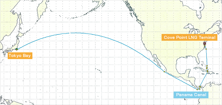Sailing Route from the Cove Point LNG Project in the United States Profile of a newbuilding LNG carrier (1) Length : About 299.9m (2) Breadth : 48.9m (3) Draft : 11.5m (4) LNG tank : Self Supporting Prismatic shape IMO Type B (SPB) cargo tank (5) Cargo capacity : 165,000m3 (6) Main engine : Tri-Fuel diesel electric propulsion system (7) Speed : 19.5 knots (8) Shipyard : Japan Marine United Co., Ltd. (9) Ship management company : Mitsui O.S.K. Lines, Ltd. (10) Ownership : Mitsui O.S.K. Lines, Ltd. 90% Tokyo LNG Tanker Co., Ltd. 10% (11) Year of delivery : 2017 (plan) (12) Name : TBD Mitsui O.S.K. Lines, Ltd. press release |
