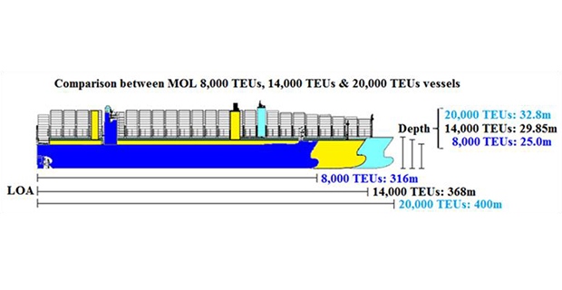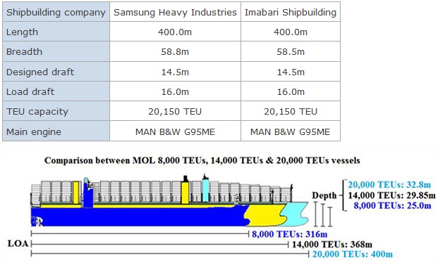 Building and Chartering Six 20,000 TEU Containerships for More Competitive Services Tokyo - March 02, 2015 Mitsui O.S.K. Lines, Ltd. (MOL; President: Koichi Muto) today announced that the company has signed a deal for construction of four 20,000 TEU containerships with Samsung Heavy Industries (President and CEO: Dae-young Park; Headquarters: Seoul, Korea). MOL also concluded an MOU for long-term chartering of two 20,000 TEU containerships with Shoei Kisen Kaisha, Ltd. (President: Yukito Higaki; Headquarters: Imabari-shi, Ehime Prefecture). The two containerships will be built at Imabari Shipbuilding Co., Ltd. (President: Yukito Higaki; Headquarters: Imabari-shi, Ehime Prefecture). The six vessels will be launched and delivered in 2017, and will serve the Asia-Europe service. The 20,000 TEU type is the world's largest among delivered and on order containerships. The newbuilding vessels will adopt various highly advanced energy-saving technologies, which will further reduce fuel consumption and cost, in comparison with 14,000 TEU types that MOL currently operates. The main engines have the specifications which enable LNG use as fuel in the future remodeling. MOL continues to offer high-quality and competitive services through fleet expansion. Main Specifications