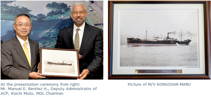 Muto met with Mr. Manuel E. Benitez H., Deputy Administrator of the Panama Canal Authority (ACP) and other staff and presented the picture of M/V KONGOSAN-MARU in appreciation of the Panama Canal's long-term relationship with MOL. 100 years ago, on June 2, 1915, the M/V KONGOSAN MARU became the first MOL-operated vessel to transit the Panama Canal. The vessel began its voyage in Kobe on March 1915, and called at Seattle, Portland, San Francisco, and San Pedro to discharge general cargo. Then, it sailed to Chile to load cargo, after which it transited the canal before making calls at Norfolk and Philadelphia and returning to the canal. MOL has moved proactively to expand its businesses since the day of establishment in 1884. MOL will provide further diversified, higher quality services tailored to customer needs.