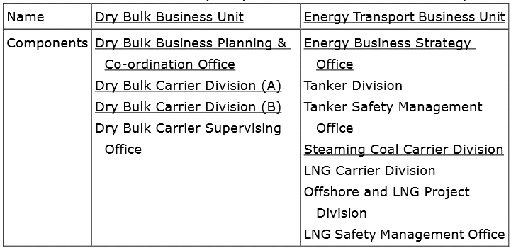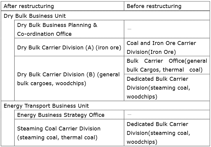 Tokyo - February 26, 2016 Mitsui O.S.K. Lines, Ltd. (MOL; President & CEO: Juinchiro Ikeda) today announced plans to establish two new business units - the Dry Bulk Business Unit and the Energy Transport Business Unit and restructure its dry bulk business divisions - effective April 1, 2016. The restructuring will not affect the company’s disclosure of financial results by segment. 1. MOL will restructure the dry bulk business divisions and establish the Dry Bulker Business Unit to most effectively implement business structural reforms to optimize the fleet portfolio and make more efficient use of management resources. In addition, the company will establish the Energy Transport Business Unit as an organization that manages business divisions by ship type, to precisely meet diversified customer needs in energy-related industries. Each business unit will deepen its ties within the organization as “One MOL” under the direction of the unit senior executives to enhance business performance and cost competitiveness, while proposing and providing optimal transport services to customers. 2. Establishment of Business Units (Newly established units are underlined)