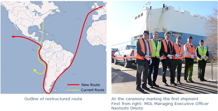 Opening New Route Bound for West Coast South America and West Coast Central America from East Coast South America Tokyo - August 12, 2016 Mitsui O.S.K. Lines, Ltd. (MOL; President & CEO: Junichiro Ikeda) today announced that it has won a contract to transport vehicles manufactured at Toyota Argentina S.A. (TASA; President: Daniel A. Herrero; Headquarters: Buenos Aires, Argentine; Plant: Zarate), to ports on West Coast South America and West Coast Central America. Vehicles produced at Zarate plant to be exported to the majority of the Latin American Region and this is also an economically important project backed by the Argentine government. MOL is supporting the initiative by providing reliable, efficient ocean transport service. With the acquisition of this new contract, MOL has restructured the existing U.S. East Coast - West Coast South America route to connect Europe with East Coast South America, via the Strait of Magellan, West Coast South America, and West Coast Central America. The revised service allows MOL to respond swiftly to changes in demand for transport of completed vehicles in this region, with direct service from East Coast South America to West Coast South America and West Coast Central America. MOL and TASA held a joint ceremony on August 10 (local time) at the Port of Zarate to mark the first shipment on the newly inaugurated route. Guests included government officials and representatives from the Zarate terminal operator and stevedoring company, as well as executives from TASA and MOL. MOL's new services will play a key role in meeting robust demand for transport of completed vehicles in this region based on the company's know-how and expertise accumulated in more than 50 years of car carrier operation.