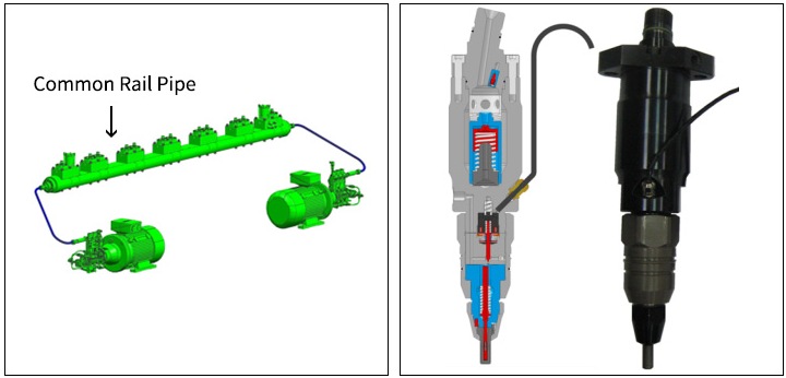 Common rail fuel injection system (left), and Fuel injection valve incorporating a solenoid (right). Image by MOL. Mitsui O.S.K. Lines, Ltd. press release |