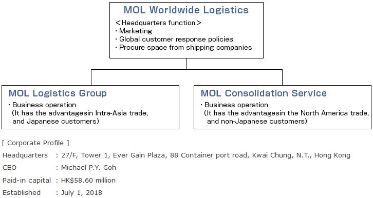 Will Serve as Headquarters for MOL NVOCC Operations Tokyo - September 06, 2018 Mitsui O.S.K. Lines, Ltd. (MOL; President & CEO: Junichiro Ikeda) today announced the establishment, effective July 1, of MOL Worldwide Logistics Ltd. (MWL), and that they will lead MOL Group non vessel operating common carrier (NVOCC) business(*1) in Hong Kong (*2). MOL Executive Officer Michael P.Y. Goh was appointed CEO of MWL. MWL has been making various preparations including permission of acquisition from relevant authorities, aiming for an October 1 launch of MWL business operations. As the MOL Group NVOCC headquarters, MWL will manage the NVOCC business of MOL Logistics (Japan) Co., Ltd. (President: Shuhei Togo; headquarters: Tokyo) and MOL Consolidation Service Ltd. (CEO: Michael P.Y. Goh; headquarters: Hong Kong), by negotiating freight rates with shipping lines by integrating the cargo volume of both companies, and handling marketing, network operation, and response to global customers. With a network of 360 offices in 61 countries, it aims to increase container cargo volume from current 350,000 TEUs to 550,000 TEUs within three years. The MOL Group continually works to enhance its NVOCC business to meet customers' diverse needs for general cargo transport with top-quality services. * 1: Non Vessel Operating Common Carrier (NVOCC) does not have own transport means (vessels), but carries cargoes between ports and to the final place of delivery by using other shipping companies. * 2: Please refer to the April 25, 2018, press release for details: MOL expands its NVOCC business with the unified brand "MOL Worldwide Logistics" MOL Group NVOCC Business Organizational Structure: