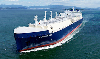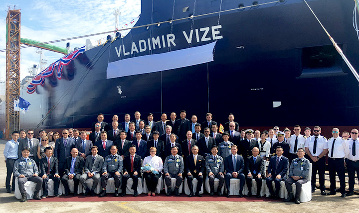 Naming ceremony on September 11. Image by Mitsui O.S.K. Lines, Ltd. Vladimir Vize Specifications: (1) Length: 299.0 m (2) Breadth: 50.00 m (3) Draft: 12.00 m (in ice sea sailing) (4) LNG tank Membrane type (5) Cargo tank capacity: 172,000 m3 (6) Ice class/Specification: RMRS ARC7/Special specifications for Arctic environment (7) Ice-break sailing capabilities: Icebreaker bow structure; 3-axis POD propeller aft structure Max. ice breaking capacity: 2.1m (when going astern) (8) Shipyard: DSME (9) Ship management company: MOL LNG Transport (Europe) Ltd. (10) Ownership: MOL 50% / China COSCO Shipping 50% Mitsui O.S.K. Lines, Ltd. press release |