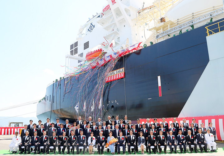 Naming ceremony. Image by Mitsui O.S.K. Lines, Ltd. Outline of Marvel Eagle Length: 299.9m Breadth: 48.90m Draft: 11.80m LNG tank: MOSS type, spherical Cargo tank capacity: 155,000m3 Main engine: 2 propulsion motors, 2 decelerators Speed: About 19.5 knots Shipyard: Kawasaki Heavy Industries, Ltd. Sakaide Shipyard Ship management company: MOL LNG Transport (Asia) Ltd. (MOL wholly owned subsidiary) Shareholding ratio: MOL 100% (Note 1) For details, please refer to the September 29, 2014 press release: MOL, Mitsui Sign Deal to Charter 2 LNG Carriers - Transporting Shale Gas-derived LNG from Cameron Project in U.S. - For details, please refer to the January 29, 2015 press release: MOL, Mitsui Sign Deal to Charter LNG Carrier - Transporting Shale Gas-derived LNG from Cameron Project in U.S. - (Note 2) For details, please refer to the October 15, 2018 press release: Launching of the "FOCUS" Project - Collaborative Innovation Transcending Business Categories; ICT-based, Data-driven Project Aims at Safer Operation and Cleaner Environment. Mitsui O.S.K. Lines, Ltd. press release |