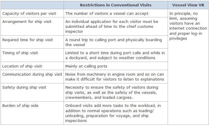 Use of "Vessel View VR", which enables a virtual ship visit "anytime and anywhere," not only eases the limits of conventional ship visits, but also allows for safe ship visits, even on vessels carrying dangerous goods.