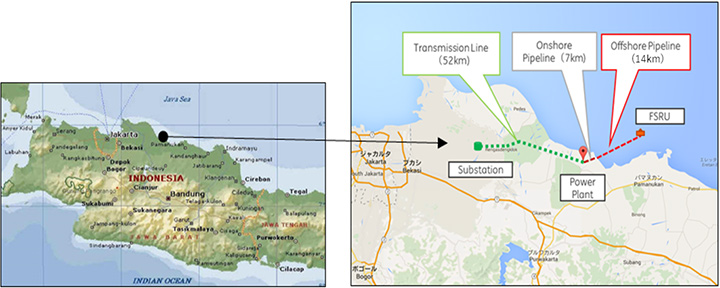 Leveraging Know-how in Asia’s 1st Gas-to-Power Project using FSRU Tokyo - December 07, 2018 Mitsui O.S.K. Lines, Ltd. (MOL; President & CEO: Junichiro Ikeda) today announced that the company has signed deals for construction of a floating storage and regasification unit (FSRU) (*1), FSRU services, and financing for the Jawa 1 Gas-Fired Project, through PT Jawa Satu Regas (JSR), a joint company of PT Pertamina (Persero; President & CEO: Nicke Widyawati; headquarters: Jakarta, Indonesia), Marubeni Corporation (President & CEO: Fumiya Kokubu; headquarters: Chuo-ku, Tokyo), and Sojitz Corporation (President & CEO: Masayoshi Fujimoto; headquarters: Chiyoda-ku, Tokyo)etc. MOL is entrusted with FSRU construction supervision, maintenance, and operation services. In this project, PT Jawa Satu Power(JSP), jointly established by Pertamina, Marubeni, and Sojitz, will build, own, and operate a gas-fired power plant with a generating capacity of 1,760MW in Indonesia's West Java province while JSR will build, own, and operate a FSRU at sea to storage and regasify LNG to supply fuel to the power plant. The power plant and the FSRU will be maintained and operated integratedly and the electricity produced by these facilities will be sold to Indonesian state-owned electricity utility PT PLN (Persero) for over 25 years. This is Asia's first such Gas-to-Power project using FSRU, electric generation and gas related facilities will be developed in an integrated manner. The FSRU will feature the optimal tank capacity and regasification capacity tailored to the plant's power generation capacity. This project is co-financed (*2) by the Japan Bank for International Cooperation, Asia Development Bank, Mizuho Bank, Ltd., MUFG Bank, Ltd., Oversea Chinese Banking Corporation, Crédit Agricole Corporate and Investment Bank, and Societe Generale Bank & Trust. Financing of private financial institutions is insured by Nippon Export and Investment Insurance. Through this project, MOL will help ensure a stable supply of electricity in Indonesia, based on its accumulated achievements and experience in LNG carrier and FSRU operation, and promote the FSRU business, which meets diverse customer needs for LNG procurement. (*1) Floating Storage and Regasification Unit: Regasifies LNG loaded at sea and sends the gas under high pressure to pipelines on shore. (*2) A funding method that uses cash flow generated from the project as the major repayment source. Outline of Jawa 1 Gas-Fired IPP Project • Location: Cilamaya, West Java, Indonesia (approx. 100km east of Jakarta) • Power generating capacity: 1,760MW • Start of operation: December 2021 (plan) • Off-taker: PT. PLN • Contract period: 25 years Outline of FSRU • Length: 292.5 m • Breadth: 43.4 m • LNG storage capacity: 170,000 m3 • Regasification capacity: 300 MMscfd • Shipyard: Samsung Heavy Industries Co., Ltd.(South Korea) Project map of Indonesia The FSRU will be placed 14km offshore in the Cilamaya Sea, east of Jakarta. The power plant will be newly constructed on shore near the FSRU site, and connected to the FSRU via a pipeline about 21km long.