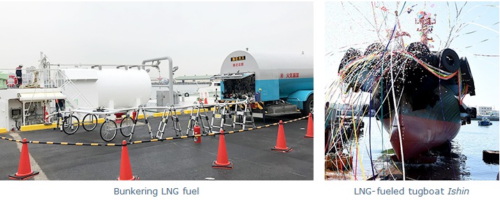 Tokyo - January 31, 2019 Mitsui O.S.K. Lines, Ltd. (MOL; President & CEO: Junichiro Ikeda) today announced that its LNG-fueled tugboat Ishin (*1) bunkered LNG fuel in Sakai Senboku Port for the first time, in preparation for test operation. MOL ordered the vessel from Kanagawa Dockyard Co., Ltd. (President: Takehito Ikoma, headquarters: Hyogo-ku, Kobe). This is the first bunkering of LNG as a vessel fuel at any port in the Kansai region. The LNG fuel was supplied by Osaka Gas Co., Ltd. (President: Takehiro Honjo, headquarters: Chuo-ku, Osaka) using a truck-to-ship LNG bunkering procedure (*2). After test sailing with LNG fuel, the Ishin is slated for delivery in late February, and will start operation in April as the first LNG-fueled tugboat serving Osaka Bay. The Ishin will be operated by Nihon Tug-Boat Co., Ltd. (President: Tetsuro Nishio, headquarters: Chuo-ku, Kobe). Working closely with the Osaka Prefecture Port and Harbor Bureau and Osaka Gas, MOL has worked to develop an LNG fuel supply system for ships in Sakai Senboku Port, which will be the first in Osaka Bay, through development of the Ishin. The MOL Group continually contributes to widening the use of LNG fuel for ships (*3) and reducing their environmental impact (*4) by building upon the safe and efficient operation of the Ishin.