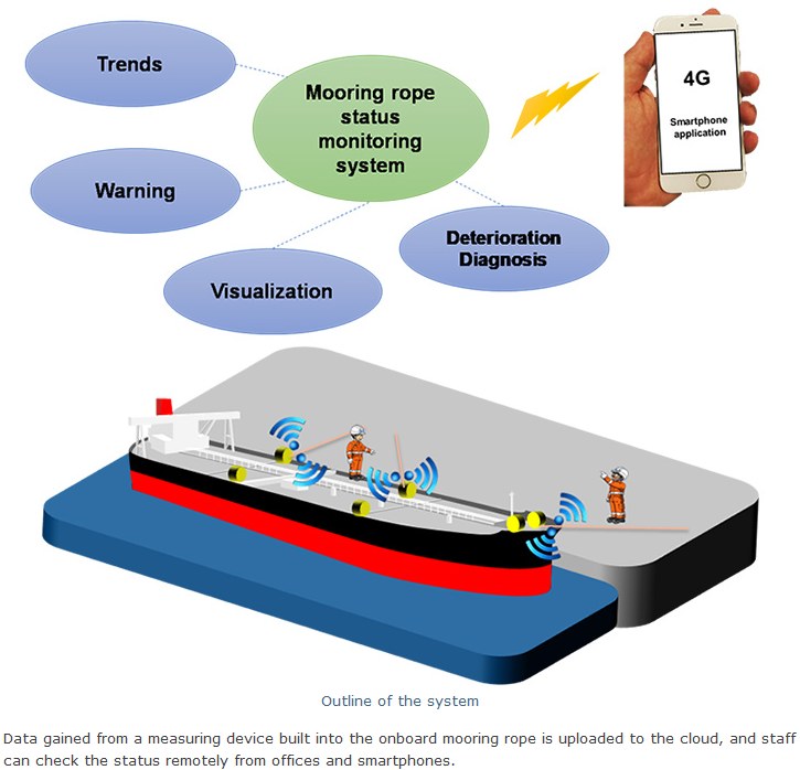 Aiming for Safe, Stress-free Cargo Handling Tokyo - March 11, 2019 Mitsui O.S.K. Lines, Ltd. (MOL; President & CEO: Junichiro Ikeda) today announced that, in partnership with MOL Coastal Shipping, Ltd. (President Masatoshi Nakajima; Headquarters Minato-ku, Tokyo), and MOL Information Systems, Ltd. (President: Tsuyoshi Yoshida; Headquarters: Minato-ku, Tokyo), it will start a demonstration test of a mooring rope with a built-in sensor, along with a rope status monitoring system. The project focuses on the mooring ropes that connect vessels to piers and other port facilities. In general, the tension on mooring ropes is hardly determined in accurate, except at certain ports equipped with tension monitors. So ropes may break because crewmembers do not take effective measures against external forces that are stronger than anticipated due to weather and sea conditions. In addition, visual inspections alone cannot always identify ropes that are damaged or deteriorating faster than expected, even if they are at the proper tension, and this may lead to premature breakage. Broken mooring ropes pose a risk of serious accidents that may damage port equipment and facilities, not to mention vessels. To address this issue, MOL, Teijin Limited, and Tesac Corporation jointly developed a mooring rope with a built-in sensor, as well as a status display system that allows crewmembers to readily determine the tension and strength of the rope. In addition, the mooring rope adopts Teijin's "TechnoraŽ" para aramid fiber, which offer excellent dimensional stability *. This test marks the first use of this rope aboard MOL Group. The demonstration test will be conducted with MOL Coastal Shipping-operated dry bulkship Cedros, which will be equipped with the ropes and monitoring system. Based on the results of the demonstration test, MOL plans to adopt the mooring ropes and status monitoring system to enhance safety during cargo handling operations in port and onboard. And in the future, it plans to leverage this experience to developing a more advanced mooring monitoring system to achieve even greater safety and effectiveness in cargo handling. This effort is a part of MOL's technological development initiative, the "ISHIN NEXT - MOL SMART SHIP PROJECT." MOL will draw upon the knowledge and expertise gained through the development process for various ship types, while taking a proactive stance in adopting the Internet of Things (IoT) to enhance safe operation and reduce vessels' environmental impact. * Dimensional stability refers to the ability of the fibers to return to their original dimensions even after repeated expansion and contraction due to tension.