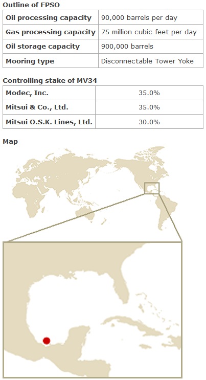 MODEC, Inc. Mitsui & Co., Ltd. Mitsui O.S.K. Lines, Ltd. April 15, 2019 MODEC, Inc. ("MODEC," Head Office: Chuo-ku, Tokyo; President & CEO: Yuji Kozai), Mitsui & Co., Ltd. ("Mitsui," Head Office: Chiyoda-ku, Tokyo; President & CEO: Tatsuo Yasunaga) and Mitsui O.S.K. Lines, Ltd. ("MOL," Head Office: Minato-ku, Tokyo; President & CEO: Junichiro Ikeda) jointly announce that Mitsui and MOL have participated in a long-term charter business ("the Project") operated by MODEC for the purpose of providing a floating production, storage, and offloading system ("the FPSO") for use in the Area 1 block offshore Mexico and a loan agreement for the Project was entered into on April 12, 2019. Mitsui and MOL invested in Area1 Mexico MV34 B.V. ("MV34"), a Dutch company established by MODEC, which will engage in FPSO leasing, operations and maintenance services. In December 2018, MV34 concluded the charter agreement with Eni Mexico S. de R.L. de C.V. ("Eni Mexico"), the operator of Area 1 block and a subsidiary of Eni S.p.A. The charter contract initially runs for 15 years, with options for extension every year thereafter up to 5 additional years. The loan agreement on a project finance basis was signed by Sumitomo Mitsui Banking Corporation (lead arranger), MUFG Bank, Ltd., Mizuho Bank, Ltd., Sumitomo Mitsui Trust Bank, Limited, Société Générale, BNP Paribas, Oversea-Chinese Banking Corporation Limited, Clifford Capital Pte. Ltd. and Crédit Industriel et Commercial. This is the first project finance for the FPSO project in Mexico. Mexico has seen numerous significant discoveries of expansive offshore oil fields in recent years, thereby giving rise to expectations of fresh demand for additional FPSO in the region. Area 1 block is owned by a consortium of two companies including Eni Mexico as operator and Qatar Petroleum. Construction of the FPSO is planned to be completed in 2021, and the FPSO will be deployed for the development of the Area 1 block at water depths of about 32 meters.
