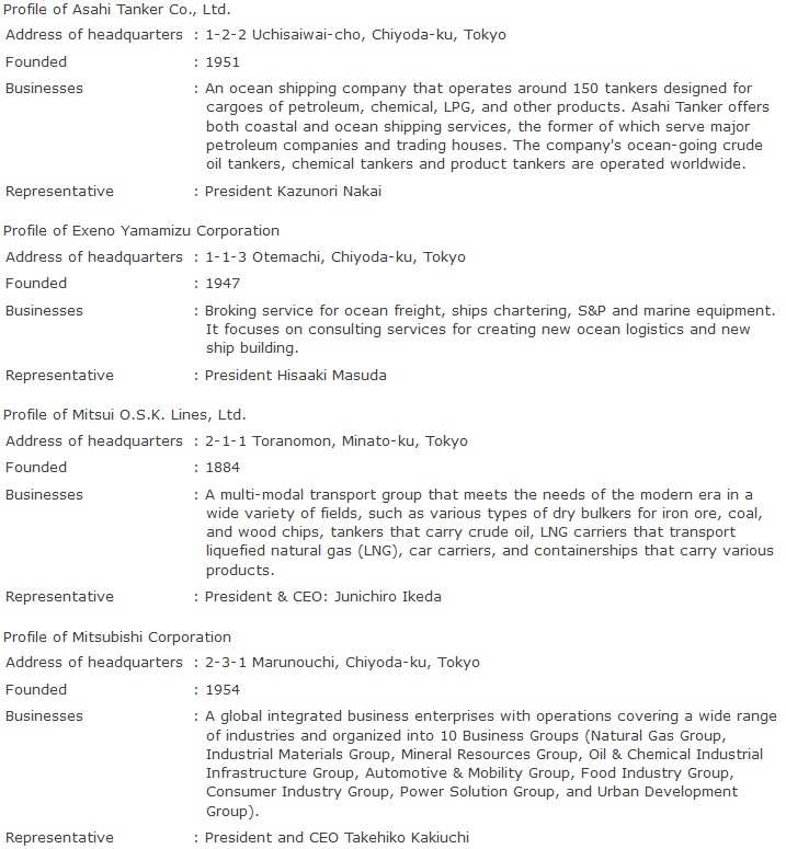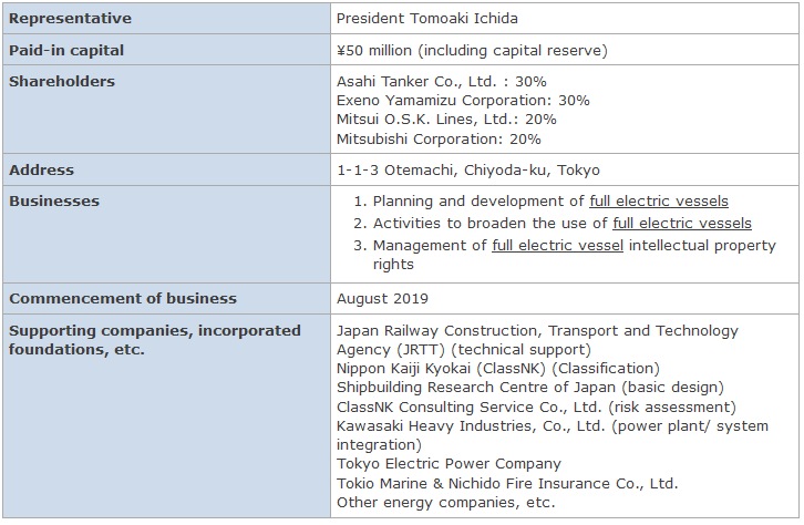Asahi Tanker Co., Ltd. Exeno Yamamizu Corporation Mitsui O.S.K. Lines, Ltd. Mitsubishi Corporation Tokyo - August 06, 2019 Asahi Tanker Co., Ltd., Exeno Yamamizu Corporation, Mitsui O.S.K. Lines Ltd., and Mitsubishi Corporation today announced their agreement to create a strategic partnership to provide new infrastructure services in the marine shipping industry that focus on electrically powered vessels. Their newly established company, e5 Lab. Inc. (e5 Lab) will work to develop and promote the greater use of these relatively clean modes of marine transport. There are a number of challenges facing Japan's shipping industry (see below), which e5 Lab will seek to address by consolidating the technologies, know-how and networks of its four major shareholders. The new company will develop a platform to provide a lineup of services that takes advantage of electrically powered vessels and other cutting-edge technologies. The aim is to leverage this platform to encourage sustainable growth and development within the marine shipping industry. 7 Challenges To Be Addressed by e5 Lab 1. Control greenhouse gas (GHG) emissions and help to combat the adverse impacts of climate change by converting vessels to electric propulsion. 2. Improve working environments and mitigate crew shortages by upgrading onboard communications systems. 3. Leverage sophisticated sensor technologies to improve ship maintenance and management, thereby ensuring that aging vessels can be operated as safely as possible 4. Leverage autonomous sailing technologies and big data to provide onshore support for crews and contribute to safe, reliable and efficient ship operations. 5. Offer an electric-vessel platform to all stakeholders in the marine shipping industry (including shipbuilders, equipment manufacturers, ship owners and operators, and cargo owners), standardize vessels and otherwise help to develop a sustainable growth model within the industry. 6. Propose standards on the swift and broader application of next-generation technologies. 7. Leverage large-capacity, rechargeable batteries to provide emergency backup power and otherwise assist with the business continuity planning of local communities. The first objective for e5 Lab will be to build the world's first zero-emission tanker by mid 2021. The tanker will be a coastal vessel powered by large-capacity batteries and will operate in Tokyo Bay. The company will also develop other kinds of electrically powered vessels to address the abovementioned challenges. Furthermore, e5 Lab will actively promote the electrification of both coastal and ocean-going vessels, and pool the technologies, human resources and operational know-how needed to achieve the 50% GHG reduction target of the International Maritime Organization (IMO) as soon as possible (the IMO wants to see annual emissions drop to half of their 2008 levels by the year 2025). By delivering five kinds of e-value ("Electrification," "Environment," "Evolution," "Efficiency," and "Economics") e5 Lab will offer new innovation to society.