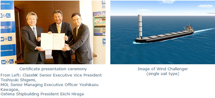 Realizing Japan's 1st Large Cargo Ship with 'Sail', Aiming at Reduction of GHGs Tokyo - October 03, 2019 Mitsui O.S.K. Lines, Ltd. Oshima Shipbuilding Co., Ltd. Mitsui O.S.K. Lines, Ltd. (MOL; President & CEO: Junichiro Ikeda) today announced that MOL and Oshima Shipbuilding Co., Ltd. (President: Eichi Hiraga; Headquarters: Saikai-shi, Nagasaki Prefecture) have jointly obtained "Approval In Principle (AIP)" from Nippon Kaiji Kyokai (ClassNK; Chairman: Koichi Fujiwara; Headquarters: Chiyoda-ku, Tokyo) for the design of a hard sail system. The system converts wind energy to propulsive force with telescopic hard sail, and is a fundamental technology of the "Wind Challenger Project" (Note 1) that MOL and Oshima Shipbuilding are spearheading. Along with other participating organizations (Note 2), MOL and Oshima Shipbuilding have played a central role in research and development on the Wind Challenger Project, which aims to reduce greenhouse gas (GHG) emissions by using wind energy. Obtaining the AIP marks the completion of the initial design related to the sail structure and controls.