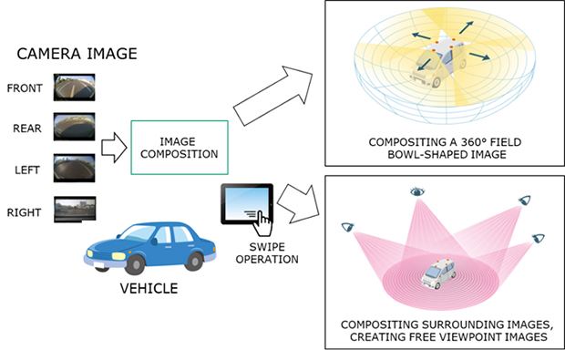The Asaka Maru (foreground) as seen by "FlyingView," and a composite image with the target vessel to be assisted (a containership's berthing operation). Image by MOL. (Note 1) "FlyingView" bird's-eye view monitoring system The system comprises four fish-eye cameras mounted on mast of the tugboat, digital compositing system, and display. Camera images are composed on the field-programmable gate array (FPGA), which has high-resolution image processing capabilities, to realize large-capacity, high-quality image processing in real time and in portable energy saving system, providing seamless, bird's-eye view image monitoring with virtually no blind spots in a wide area surrounding the tugboat. FPGA is an integrated circuit that the purchaser and designer can custom-configure after manufacturing, and is a type of programable logistic device (PLD) in a broad sense. "FlyingView" is a registered trademark of OKI.
