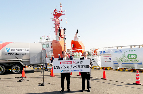 Developing an LNG Fuel Supply Terminal and Promoting the Use of Natural Gas Tokyo - November 08, 2019 Toho Gas Co., Ltd. Mitsui O.S.K. Lines, Ltd. Toho Gas Co., Ltd. (President: Yoshiro Tominari; Headquarters: Atsuta-ku, Nagoya) and Mitsui O.S.K. Lines, Ltd. (MOL; President & CEO: Junichiro Ikeda) today announced the implementation of a demonstration test to supply LNG (LNG bunkering) to the LNG-fueled (Note1) tugboat Ishin (Note2) in the Port of Nagoya. This marked the first LNG bunkering in the Port of Nagoya, and the test confirmed that LNG can be safely supplied to vessels at the port. LNG was transported via truck from the Toho Gas Chita-Midorihama LNG Terminal (Chita-shi, Aichi Prefecture), and supplied with a truck-to-ship system (Note 3) to Ishin, berthed at the Port of Nagoya's Garden Pier. Also cooperating in the demonstration test were, Niyac Corporation (President: Kota Horie; Headquarters: Koto-ku, Tokyo), which provides LNG land transport for Toho Gas, MOL Marine Co., Ltd. (President: Toshikazu Inaoka; Headquarters: Minato-ku, Tokyo), which provides maritime consulting services, and Nihon-Tug-Boat Co., Ltd. (President: Tetsuro Nishio, Headquarters: Chuo-ku, Kobe), which operates Ishin. Based on the findings of the demonstration test, Toho Gas and MOL will continue working to reduce the environmental impact of the maritime industry by promoting the use of LNG fuel by vessels calling at the Port of Nagoya.